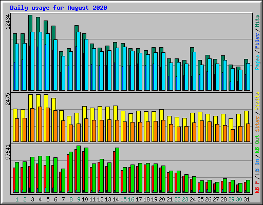 | Day | Hits | Files | Pages | Visits | Sites | kB F | kB In | kB Out | ||||||||
